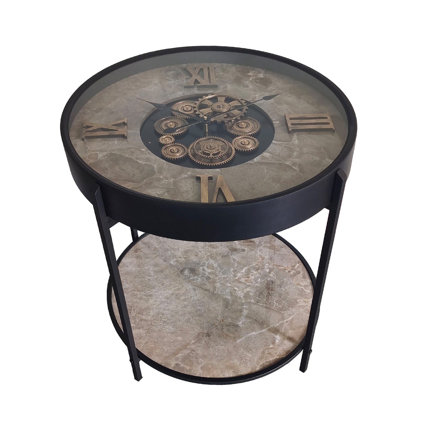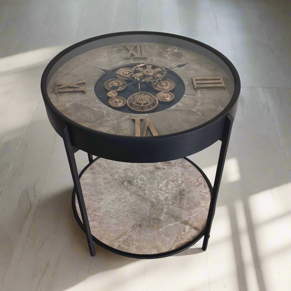 This unique clock table is a captivating blend of industrial style and vintage charm. The circular table top features a mesmerizing clock face with intricate gears and Roman numerals, adding a touch of steampunk aesthetic to your space. The lower shelf provides ample space for displaying books, plants, or other decorative items.